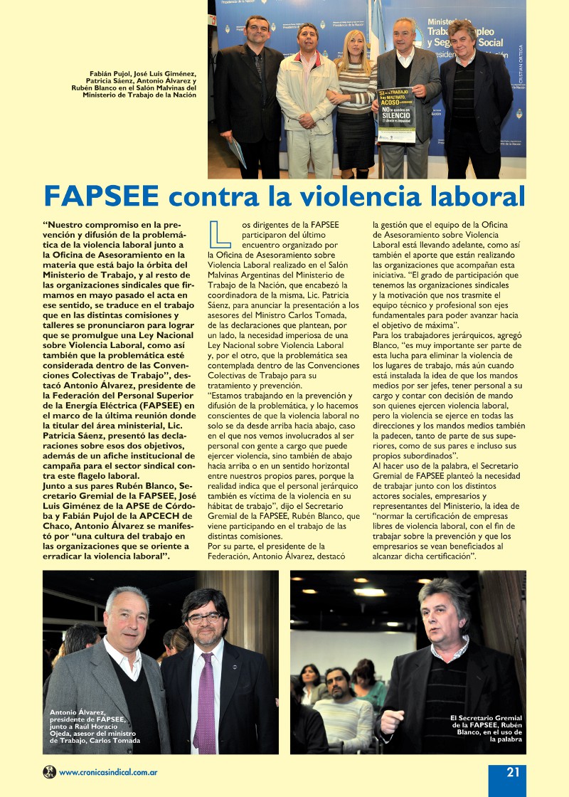 En mayo de 2012, el Ministerio y las organizaciones gremiales participantes firmamos un Acta en la que ratificamos nuestro compromiso de condenar toda forma de Violencia Laboral, realizar acciones de prevención a través de la difusión de información y/o capacitación a representantes gremiales y trabajadores, asistir y acompañar a trabajadores que estén atravesando situaciones de violencia laboral en sus ámbitos de trabajo; y desarrollar medidas adecuadas que promuevan el trabajo digno sin Violencia Laboral en nuestras organizaciones. También en el marco del acuerdo se establece el compromiso de fomentar la utilización de la negociación colectiva como instrumento fundamental para establecer políticas de prevención y tratamiento en el ámbito laboral, y la aprobación de una ley nacional sobre el tema. Dada la importancia e incidencia que pudiera tener esta problemática en el ámbito de EPEC, nuestra Asociación está trabajando activamente en este programa, asistiendo a las reuniones y contribuyendo incluso con un software que será utilizado para recopilar en un foro y repositorio digital las estadísticas y todo el material producido por los equipos de trabajo.